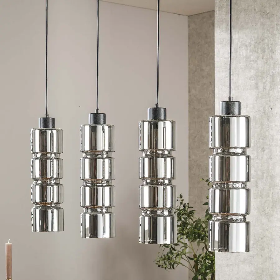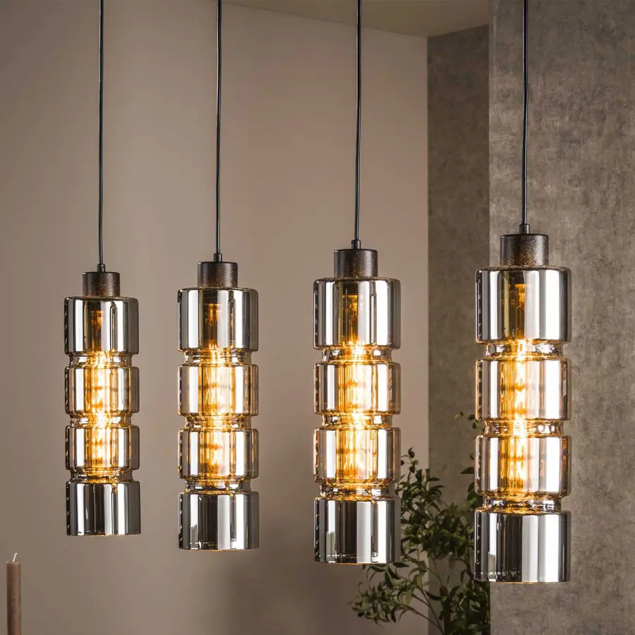 The Black Optic Cylinder Pendant Light features a refined cylindrical form crafted from handmade smoky glass. Its internal horizontal ridges subtly capture and refract the light, creating a striking ladder-like glow that adds visual rhythm, tactile depth, and a sophisticated industrial character to any interior.
